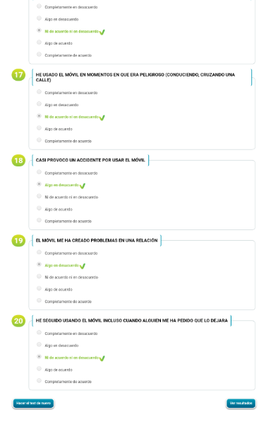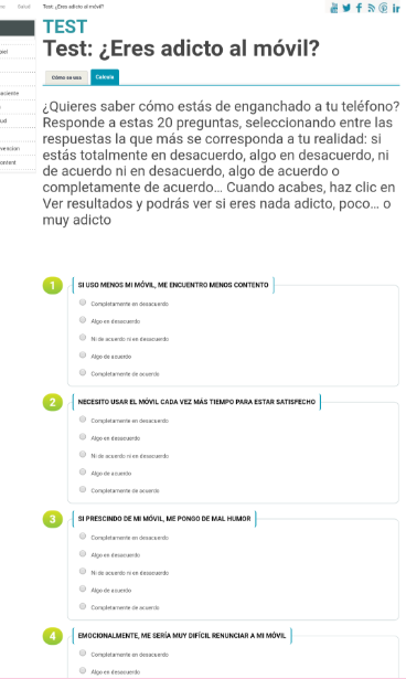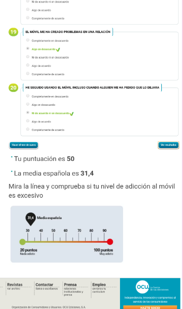 Aquí os ofrecemos un enlace que os conducirá directamente a una pagina web de la organización OCU donde podréis realizar un test para saber el grado de acción al móvil que posees. Aquí os dejamos una breve explicación sobre el test: